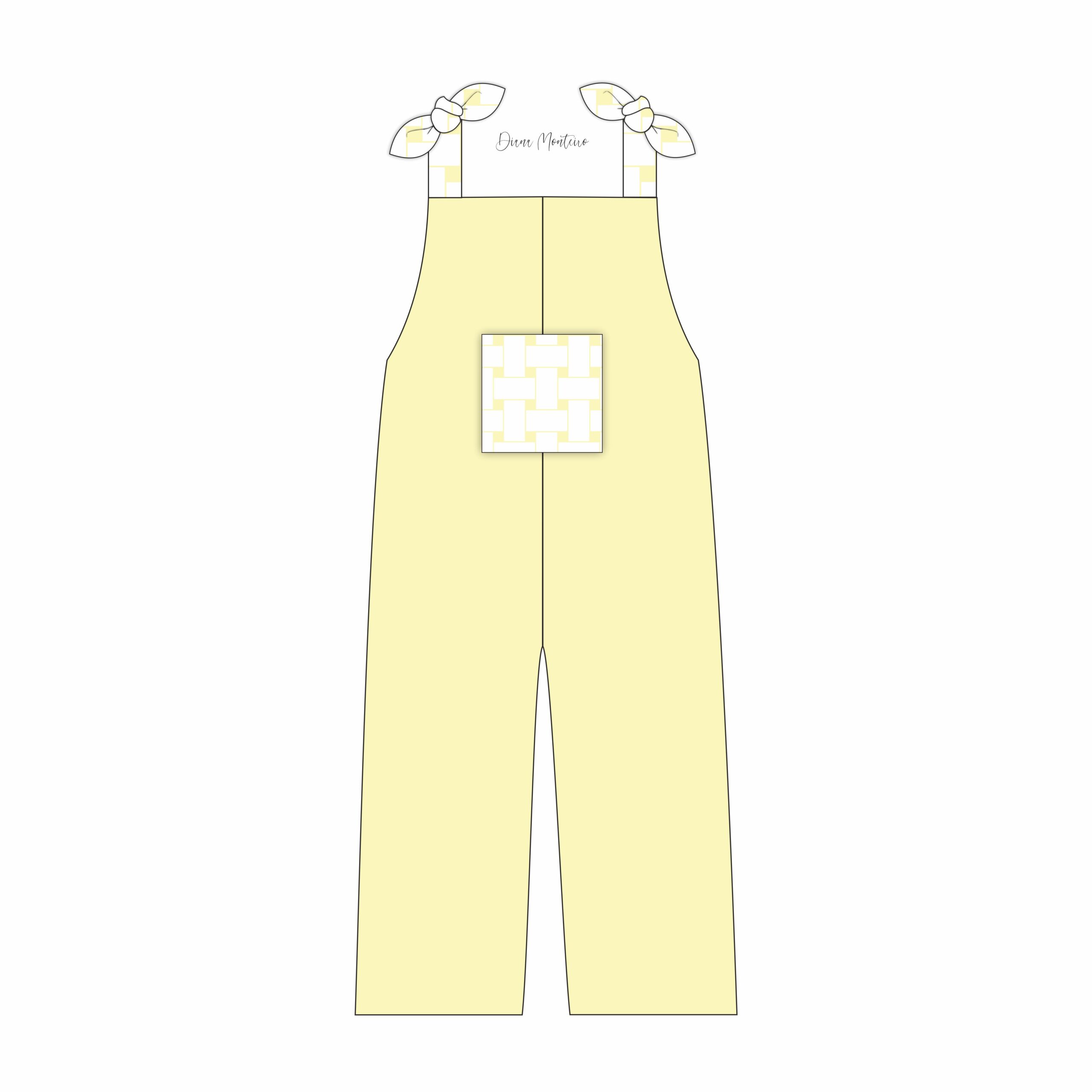 Detalhes: Molde de macacão com bolso à frente, e alças de 2,5cm de atar nos ombros. Unissexo. Disponível dos 2 aos 12 anos.